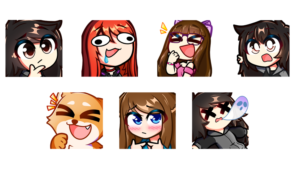 Each emote includes: 500x500px, 112x112, 56x56, 28x28 transparent PNG.
